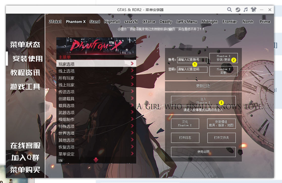 首页 新闻资讯 辅助介绍 了解其他更多热门菜单! Lexis词汇 辅助介绍 Atlas阿特拉斯 使用教程 INFamous 辅助介绍 阿尔法Alpha 辅助介绍 XiRush 辅助介绍 天若Mdays 辅助介绍 Frieza辅助 XiPro辅助 Stand辅助 教程网 下载安装器 在线购买 荒野大镖客2辅助 菜单 首页 新闻资讯 辅助介绍 了解其他更多热门菜单! Lexis词汇 辅助介绍 Atlas阿特拉斯 使用教程 INFamous 辅助介绍 阿尔法Alpha 辅助介绍 XiRush 辅助介绍 天若Mdays 辅助介绍 Frieza辅助 XiPro辅助 Stand辅助 教程网 下载安装器 在线购买 荒野大镖客2辅助 搜索 搜索 Close this search box. GTA5 幻影X辅助使用教程 查看更详细的菜单教程,请点击访问教程网:https://www.yinse.wiki 目录 一.安装&注入 幻影X辅助 下载安装器【安装器下载】GTA5 & RDR2 菜单安装器 – GTA5_RDR2_教程网 (www.yinse.wiki)注入下载后运行注入器如图操作:账号密码请复制粘贴,不要手打 [保存好你的账号密码,丢失无法找回]安装只需要一遍,下次使用,直接点击注入幻影即可故事模式下注入,弹出黑框注入成功后在故事模式中按F5加载幻影第一次注入成功然后重启游戏,重新注入,故事模式按F5加载即可如果按F5出现下图这个提示无需理会需要看的是cmd控制台黑色窗口是否有红色字体如果有根据提示判断幻影X 按F5加载时左下角提示解析 – 端游发烧友交流社区 (www.yinse.wiki) 如遇注入失败、游戏崩溃等问题,看此贴,(没遇到直接无视)各种菜单注入时游戏闪退崩溃 [所有菜单通用贴] – GTA5_RDR2_教程网 (www.yinse.wiki) 二.按键说明 F5 呼出/隐藏菜单小键盘8 2 控制上下小键盘4 6 控制左右小键盘5 确定; 0 返回默认快捷键N是无障碍 X是墙上驾驶 小键盘1是自杀 更多教程幻影X辅助全方位教程 查看更详细的菜单教程,请点击访问教程网:https://www.yinse.wiki GTA5辅助 辅助类别💎2Take1、Stand、午夜、XiPro、北域、黄昏、Frieza、暗星、Ox、全球最顶级的辅助菜单,国外专业团队打造,玩爆其他国产和国外辅助,全系统支持,给您完美的的游戏享受!承诺提供永久专业售后! 联系我们 售后咨询 联系客服 相关教程 更完善的教程网 下载辅助安装器 官方Q群 加入④群 加入③群 加入②群 Gta5辅助 © 2023 All Rights Reserved